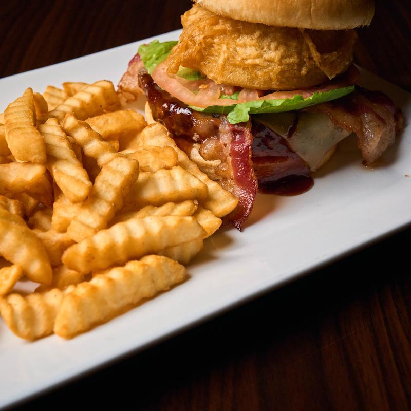 Pepper Jack cheese, BBQ sauce, bacon, fried onion rings, lettuce, and tomato