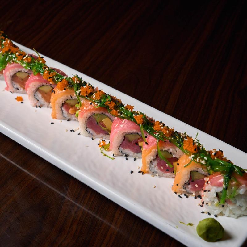Salmon, tuna, avocado, cucumber, seaweed salad, masago, and sesame seeds