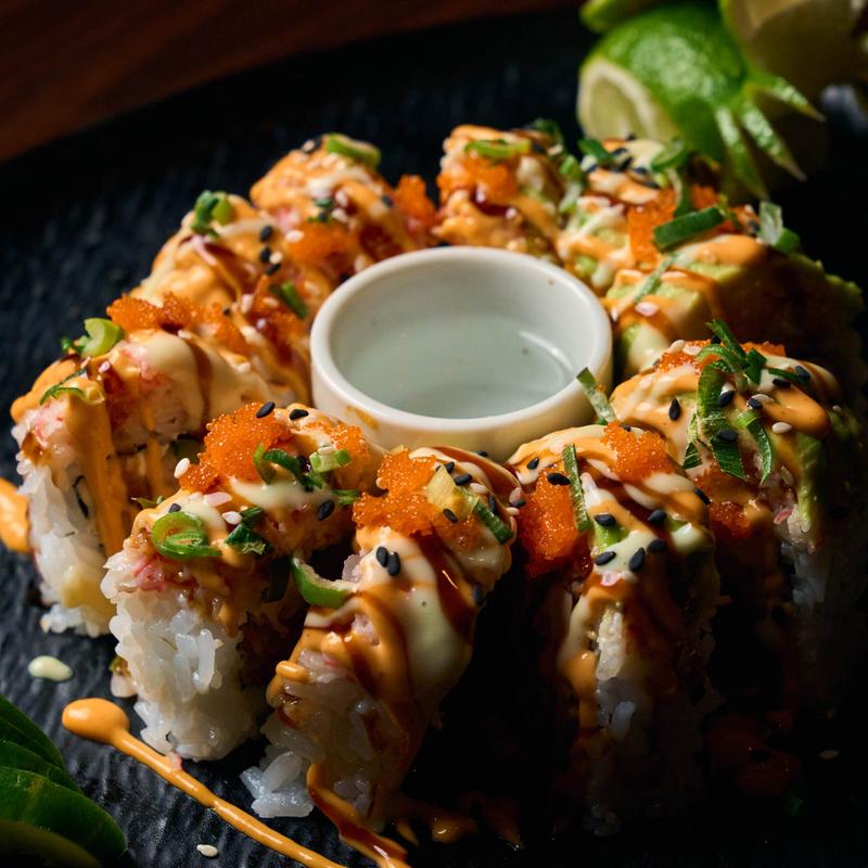 Tuna outside and inside, snow crab, jalapeños, cilantro, mango, fried onions, spicy mayo, sriracha, and red tobiko (flying fish roe)